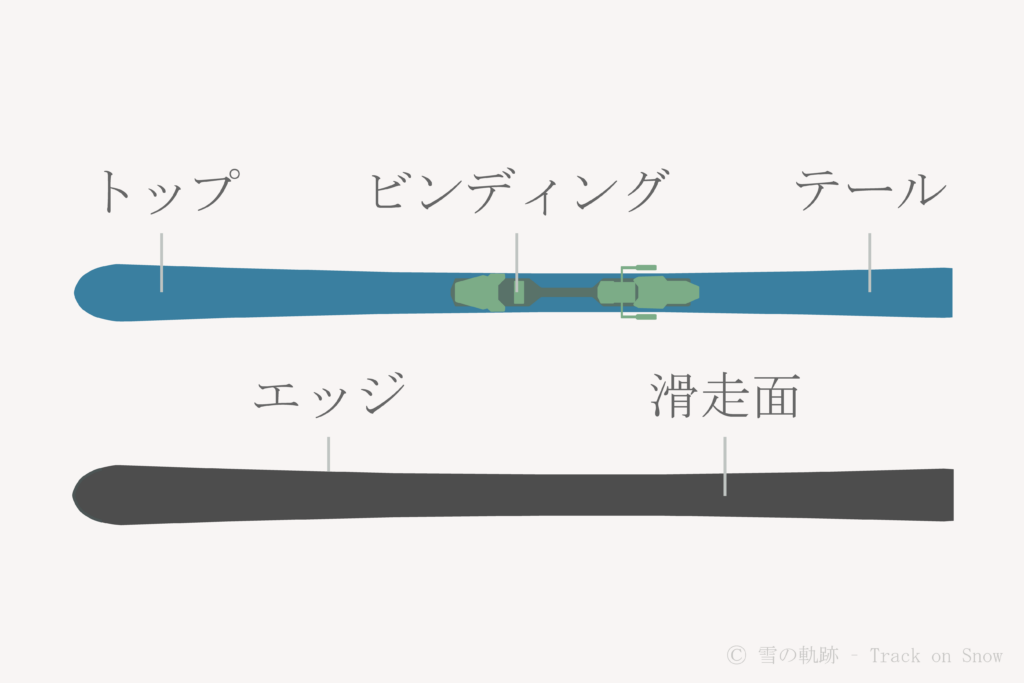 レッスンなどで言及されるスキー板の部位は主に下記のものです。